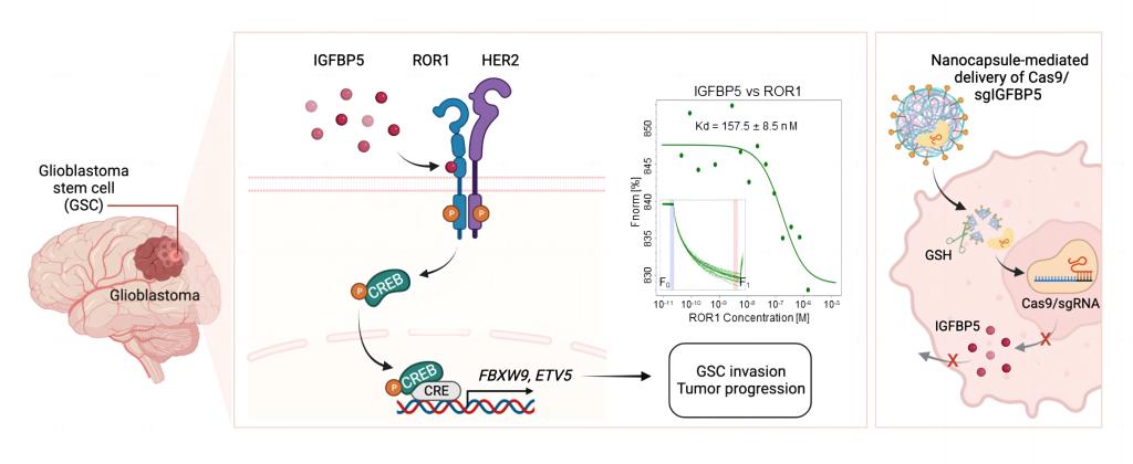 弥漫性浸润是胶质母细胞瘤(GBM)治疗耐药和复发的主要原因。在GBM中存在一类具有干细胞特性的细胞群:胶质母细胞瘤干细胞(GSC),是GBM肿瘤形成、发生发展、浸润侵袭、复发和导致放化疗抗性的根本原因。然而针对GSC侵袭性的具体分子机制仍不清楚。在此,尹金龙课题组发现胰岛素样生长因子结合蛋白5(IGFBP5)是受体酪氨酸激酶样孤儿受体1(ROR1)的配体,是GSC侵袭的一个重要且具有应用前途的靶点。在体外和体内,特别是在患者来源的异种移植动物模型中,IGFBP5敲低抑制了GSC的侵袭能力。机制上IGFBP5与ROR1结合并促进ROR1/HER2异二聚体的形成,诱导CREB的磷酸化并在转录水平调控ETV5与FBXW9的表达,从而促进GSC的侵袭和肿瘤生长。同时,利用实验室开发的智能脑靶向纳米胶囊介导的CRISPR/Cas9 IGFBP5基因编辑可显著抑制GSC的侵袭和下游基因表达,并延长了GBM原位荷瘤小鼠的生存期。IGFBP5通过ROR1/HER2-CREB信号轴调控GBM的侵袭这一新发现,为GBM治疗提供了新的治疗靶点和思路。