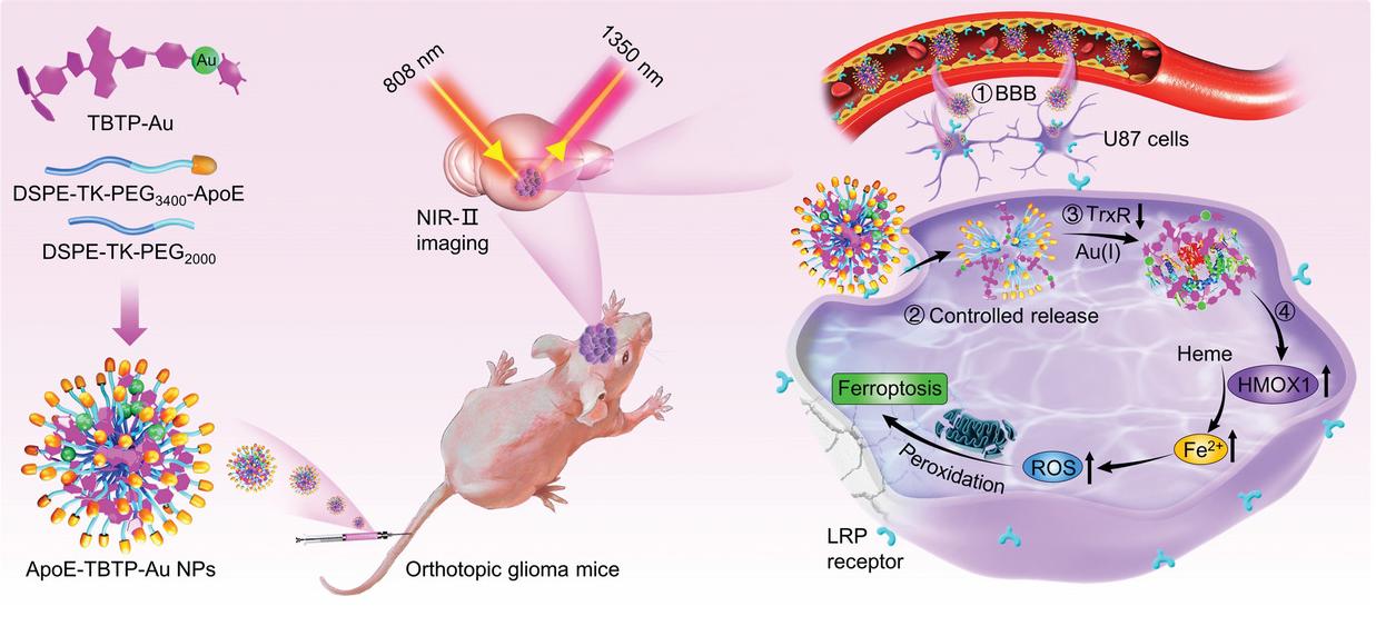 铁死亡是一种新型的细胞死亡方式,有望为脑胶质瘤的安全高效诊疗提供新的机会,但是现有的铁死亡剂的特异性激活效率低且缺乏高效的体内示踪功能。近红外二区(1000-1700 nm)聚集诱导发光(Aggregation-induced emission, AIE)活体荧光成像技术具有穿透深、聚集增强、信噪比高、实时成像的优势,是一项高效的辅助研究纳米药物体内代谢及分布的先进示踪技术。实验室基于脑胶质瘤特点和AIE示踪技术优势,首次开发出具有可视化近红外二区荧光成像功能与高特异性铁死亡Au(I)活性中心于一体的脑靶向铁死亡剂,利用其与肿瘤高表达的硫氧还蛋白还原酶(TrxR)特异性结合,不仅有效监测纳米药物的血脑屏障穿透及体内分布,而且特异性激活TrxR-HMOX1介导的非经典铁死亡通路,实现对脑胶质瘤的有效抑制并延长小鼠生存周期。该研究为开发更多的下一代先进可视化纳米药物提供了重要借鉴。