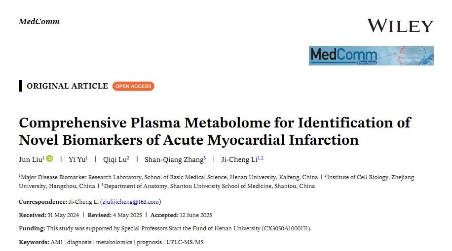 近日,基础医学院李继承教授团队在《MedComm》杂志(IF 10.7,一区Top)在线发表了题为“Comprehensive Plasma Metabolome for Identification of Novel Biomarkers of Acute Myocardial Infarction”的文章。李继承教授为唯一通讯作者,博士后刘俊为第一作者。新葡萄8883国际官网为第一完成单位和第一通讯作者单位。