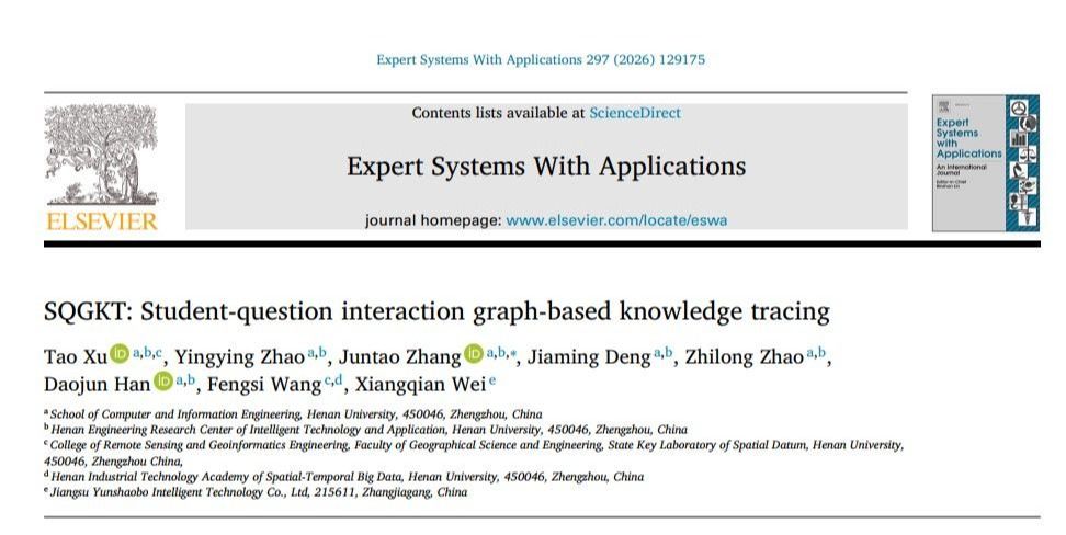 在研究成果二中,研究团队提出了一种基于学生问题交互图的知识追踪模型(SQGKT)。通过构建学生-问题交互图,将动态学习过程转化为图结构,更加直观地展现学生的学习路径和知识掌握情况。同时,还引入动态注意力机制,使SQGKT能够聚焦于关键信息,进一步提升了知识追踪的准确性和可靠性。三个公开数据集(ASSISTments 2009、ASSISTments 2012、Junyi)的实验结果表明,SQGKT模型的性能明显优于现有算法,为学生学习过程建模提供了新思路,为大规模因材施教战略的实施提供重要技术手段。该研究成果由新葡萄8883国际官网计算机与信息工程学院、新葡萄8883国际官网空间基准全国重点实验室、江苏云劭博智能科技有限公司等单位共同完成。