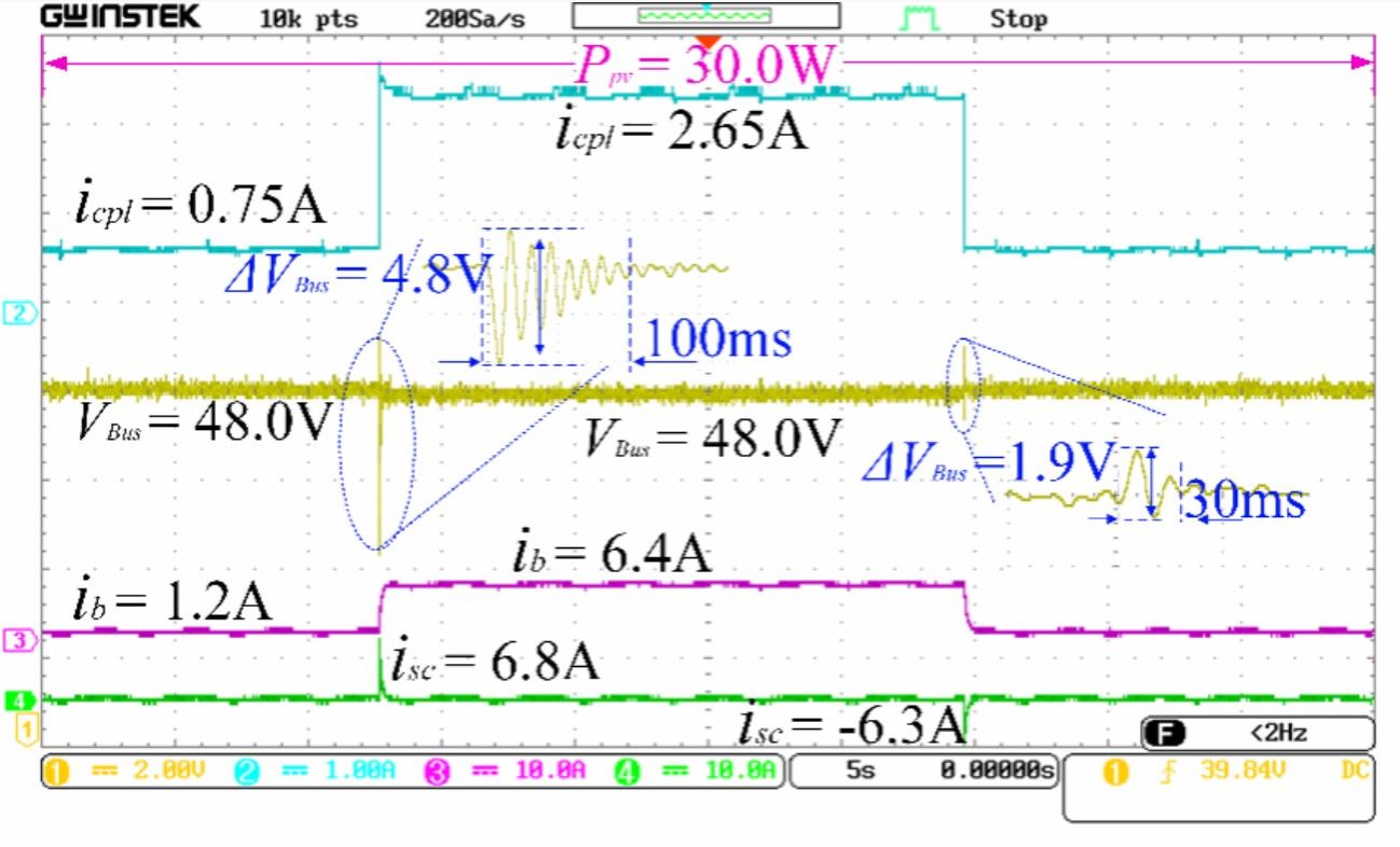 实验结果如图7所示,该方法稳态误差保持在1%以内,母线电压动态误差和调节时间分别降低34.24%-44.44%和16.66%-40.00%,在有限计算能力下显著提升了系统的动态响应与稳定性。