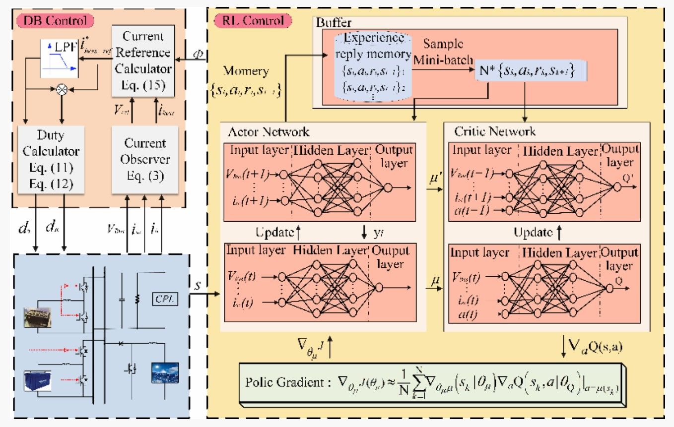 团队提出了一种结合深度强化学习的混合储能系统无差拍控制算法(RL-DBC),如图6所示。在该方法中,非线性功率损耗和模型失配引起的混合储能系统最佳电流参考值变化被视为集中扰动,通过深度确定性策略梯度算法进行补偿,并根据精确的参考电流生成最佳控制比,从而消除系统稳态误差并提高动态响应速度。该方法利用深度确定性策略梯度算法补偿非线性功率损耗与模型失配,生成最优控制比。