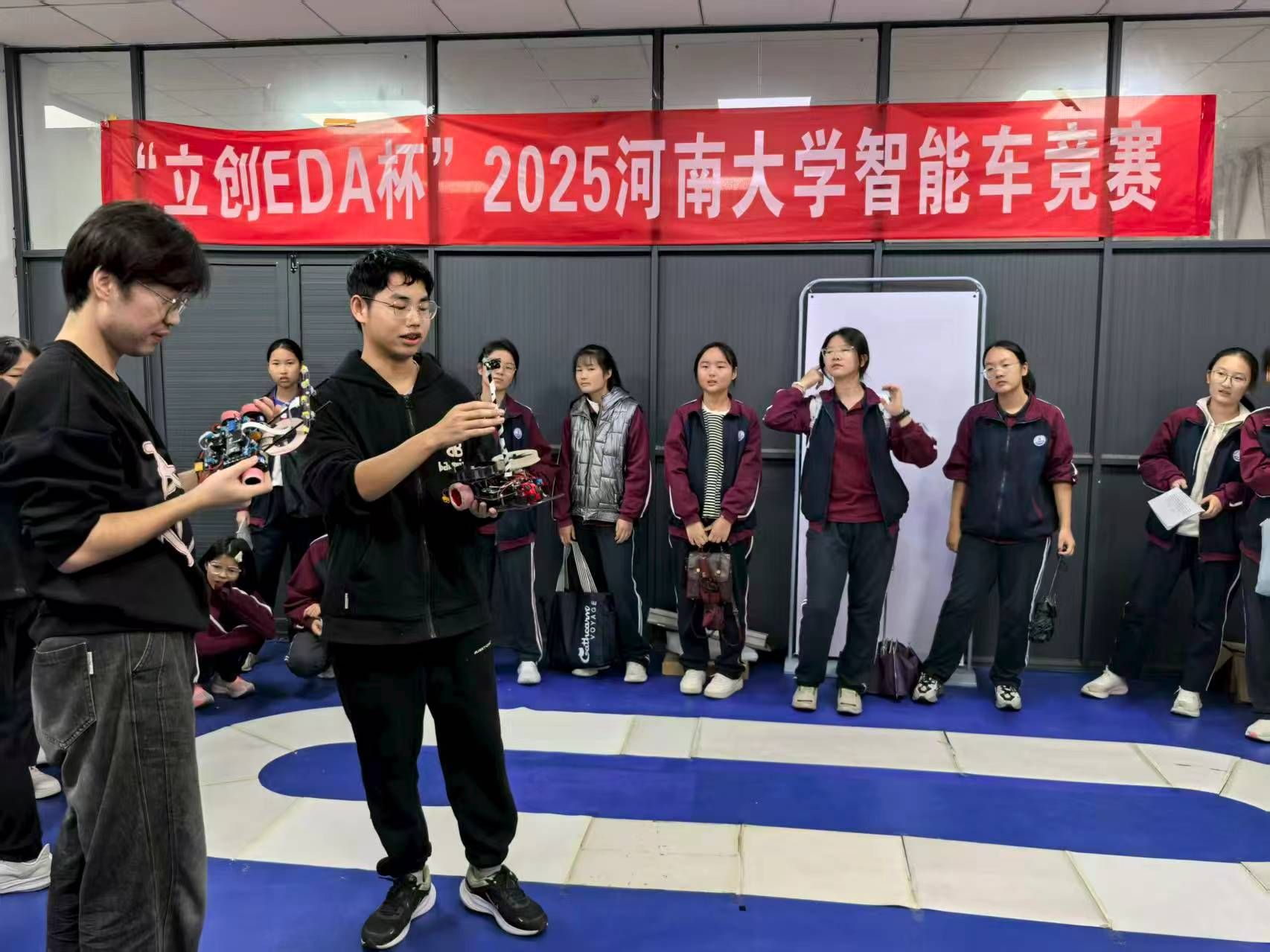 随后,学生们前往创新创业实验室,观摩智能车竞赛参赛作品,包括快速充电小车、颜色识别行驶小车等,直观感受物理知识的实践应用。现场同步开展知识抢答活动,答对学生获“专属河大校园卡”,进一步激发探索热情。