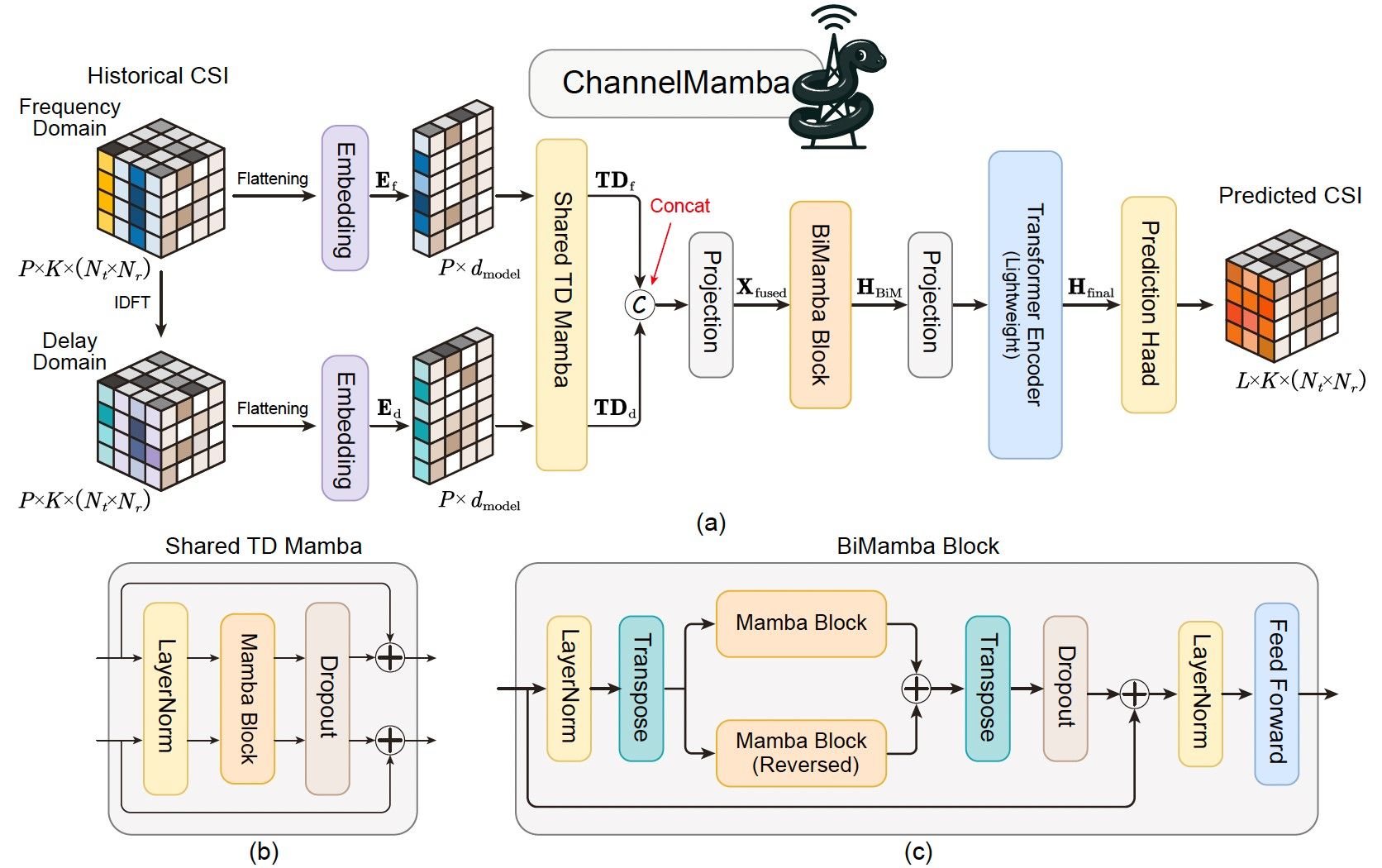 面向6G大规模多输入多输出(m-MIMO)物联网系统在高移动性场景下面临的信道老化与预测效率瓶颈,科研团队首次将新兴的Mamba架构引入无线信道预测领域,提出了名为ChannelMamba的端到端预测模型。