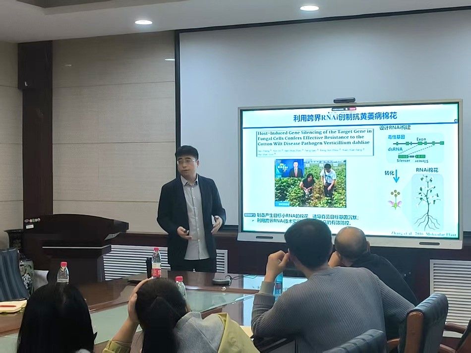 10月29日,实验室特邀中国科学院新疆生态与地理研究所研究员张涛,以“跨界RNAi在棉花抗病-蚜的有效应用及抗性作物的种质创新”为主题,举办师生分享交流会。讲座上,张涛研究员分别围绕“发现植物-真菌中跨界抗病RNAi新途径、利用跨界RNAi介导棉花抗病抗蚜的原理及分子机制、跨界RNAi技术应用关键节点以及基于该技术进行棉花抗性种质创制”等内容进行分享。张涛研究员还分享了该技术抗其他植物真菌病害的尝试,证明该技术在植物真菌病害抗病机制中发挥的重要作用。此次交流会的成功举行,使师生系统掌握了跨界RNAi技术在棉花抗病抗蚜领域的前沿应用成果,明晰了棉花抗性作物种质创新的方向。