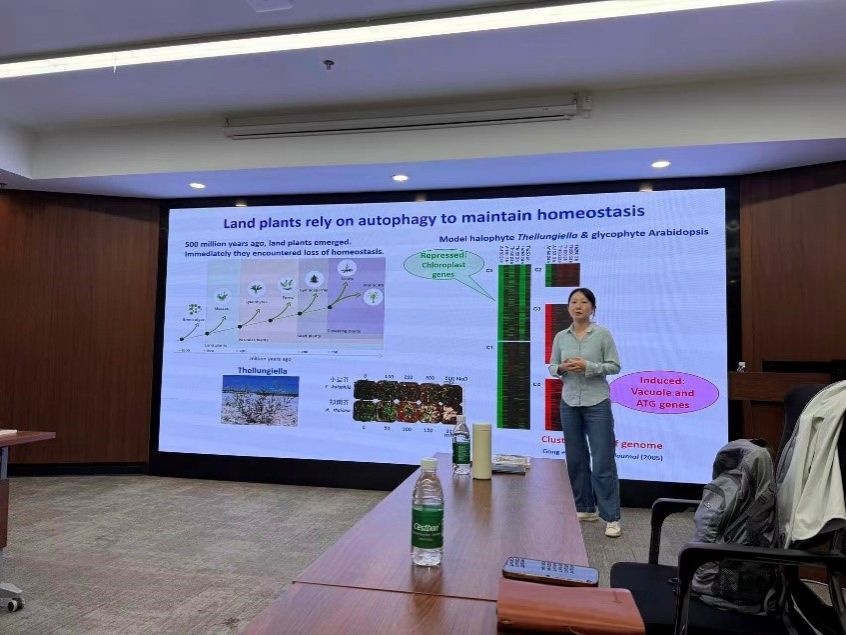 9月18日,实验室邀请上海交通大学龚清秋副教授做“细胞自噬与植物抗逆”专题科普讲座。报告系统介绍了细胞自噬在植物抗逆调控中的重要作用,并对其团队近些年的科研成果进行了总结,发现了植物特有蛋白NRP介导的胞内运输与信号通路,并揭示磷脂酰肌醇3-磷酸(PI3P)及其磷酸酶MTM2在调控自噬过程中的核心功能。并研究构建了合成叶绿体自噬受体,实现了对叶绿体降解的精准调控,探讨了线粒体能量抑制对内膜系统与自噬的影响。这些成果为通过调控自噬提升作物抗逆性、生物量与产量提供了新思路与实验依据。