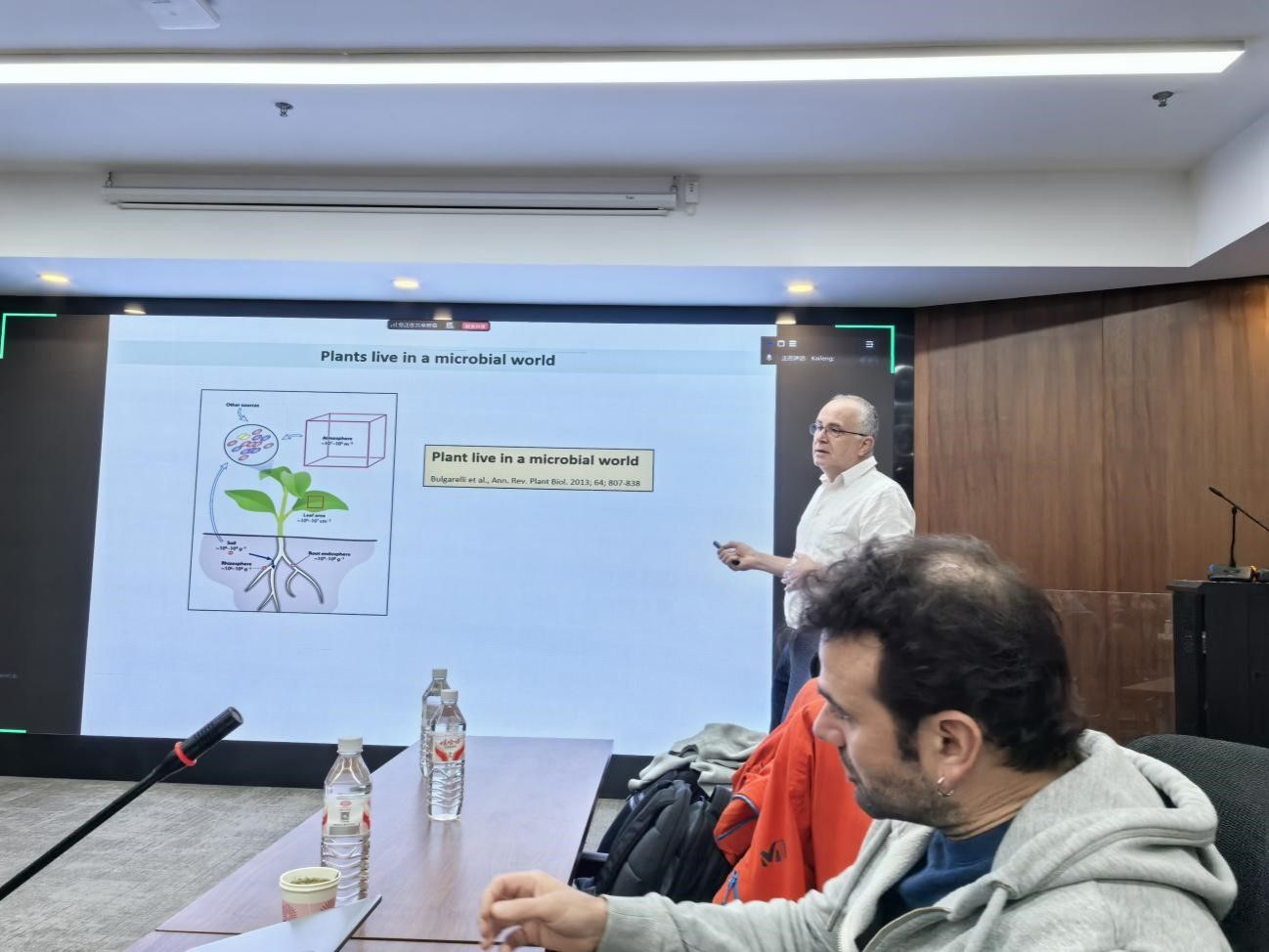 10月24日,实验室邀请法国巴黎萨克雷大学Pascal Ratet教授作“非典型根瘤菌在同一宿主上引发结瘤和致病”的报告。Ratet教授主要聚焦于豆科植物与根瘤菌的相互作用,特别是根瘤形成、氮固定机制以及相关遗传调控。本次报告中,Ratet教授从微生物共生-寄生连续体的概念出发,发现在根瘤菌-豆科植物互动中,典型根瘤菌诱导氮固定根瘤,但一些菌株可能展示寄生特征。该研究中,Ratet教授从自家花园土壤中分离到一种非典型根瘤菌株(Ensifer adhaerens T4),它能在同一豆科宿主上引发结瘤(nodulation)和致病(pathogenesis):能作为根瘤内生菌与有效根瘤菌共定殖根瘤,而单独接种时诱导无效根瘤;在幼苗阶段单独接种导致植物死亡。Ratet教授团队还进一步解析了产生不同效应的分子机制。该工作揭示了共生与致病的连续性,对植物-微生物共生的演化具有重要启示。