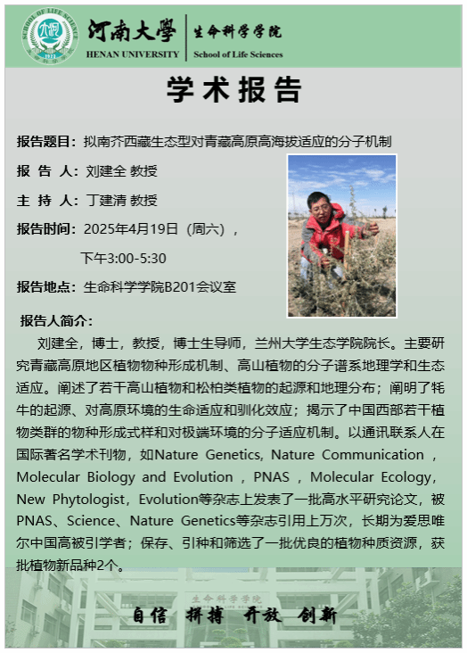 刘建全:拟南芥西藏生态型对青藏高原高海拔适应的分子机制(时间:4月19日)